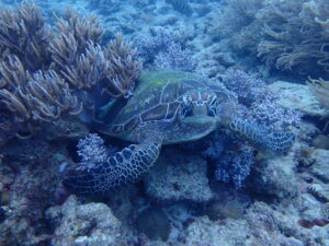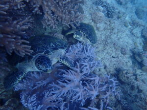 スノーケルだと深いところにいるカメはなかなか見づらいですからね