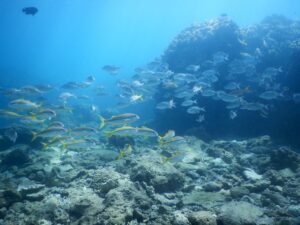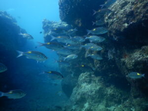 ノコギリダイやアカヒメジの群れは透明度の高い冬の海で