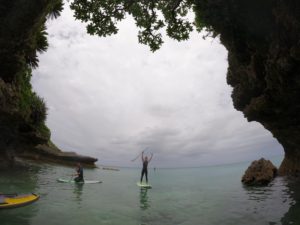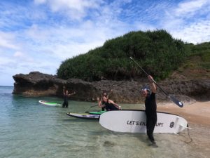 大き目のサーフィンボードに立って、パドルを使って進んでいきます。